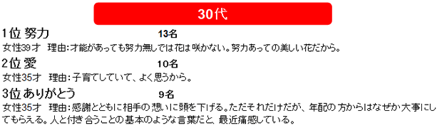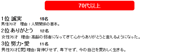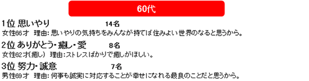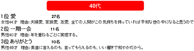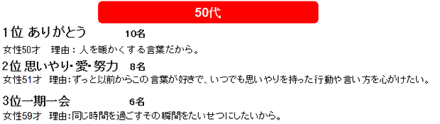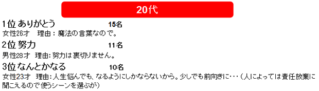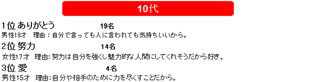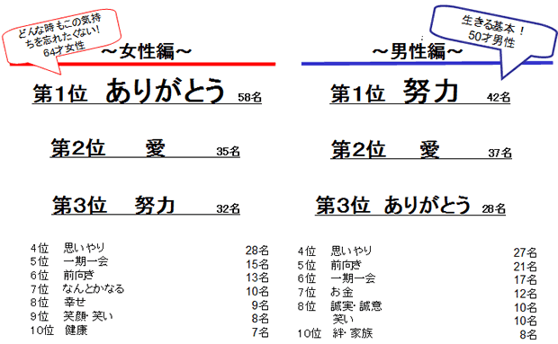 家族愛や夫婦愛だけではなく愛国心など幅広く愛が使われていました。そして「ありがとう」は全世代、男女共に平均的に選ばれており、今回のアンケートは個人的に好きな言葉ではなく人と人との繋がりにおいての理由が大変多くみられました。