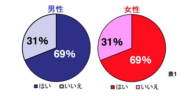 自分の体臭が臭いと思ったことのある質問に対し「はい」と回答した人は男女共にまったく同じ割り合いで約70%という結果になりました。