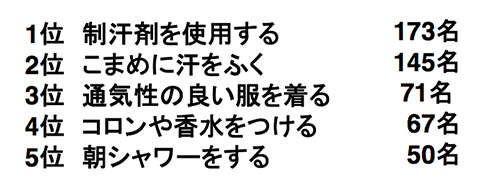 また、匂いを出さない為にどんな工夫をしていますかという問いに対して下記のような結果となりました。