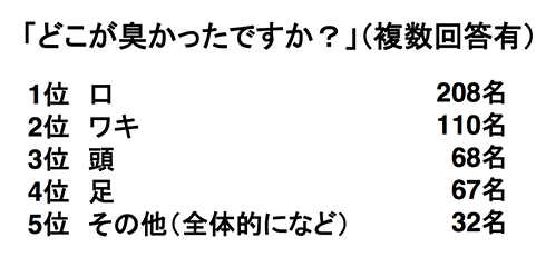 また相手のどこがくさかったか?という問いに対しては圧倒的に「口臭」と「ワキ」が締めていました。