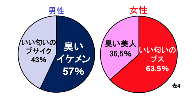Q、自分がなるとしたら「臭いイケメン/美人」「いい匂いのブサイク/ブス」どちらですか?(男女各n=200)表4