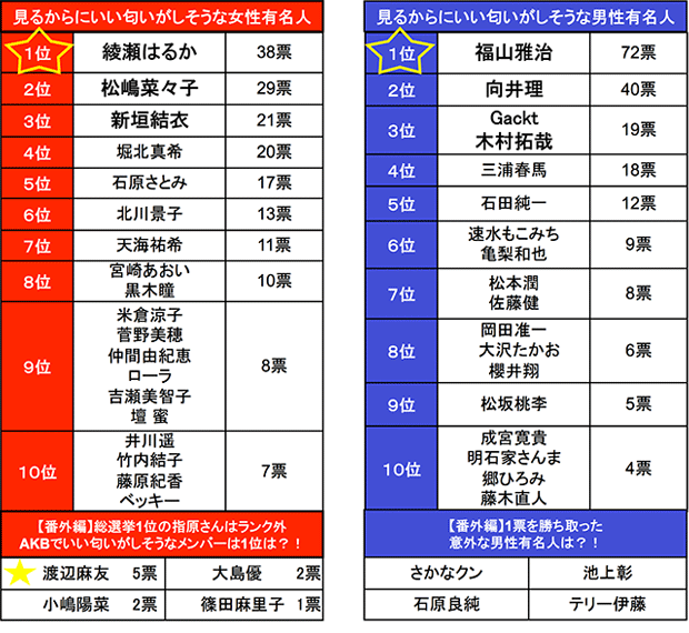 女性1位「綾瀬はるか」男性1位「福山雅治」