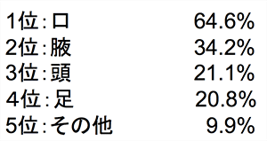 上記の結果に対し、またどういう時に「クサイ」と感じましたか?という問いでは、「口」という回答に関しては会話をしている時という意見が半数以上を占め、「腋」と「頭」という回答に関しては汗ばんでいる時という意見が多くみられました。理由はないが近くに寄っただけで匂いを感じたという意見も多くみられ、汗をかいていない時でもエチケットとして匂いに常に敏感でなければなりません。クサイと思っている男女が85%もいる反面、クサイと思っている本人もクサイと思われているという結果になりました。