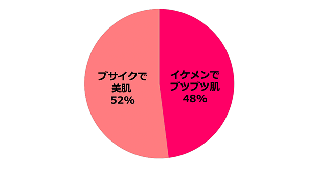 男性の外見で肌は気になりますか?という質問に対し約60%以上の女性が気になると回答しました。しかし、男性に美肌でいるために努力をしてほしいと思いますか?と聞いたところ「はい」と答えたのは全体のわずか3割しかいませんでした。また、「イケメンでブツブツ肌」「ブサイクで美肌」のどちらを選びますか?という質問に対し半数以上の女性が「ブサイクで美肌」を選ぶと回答しました。