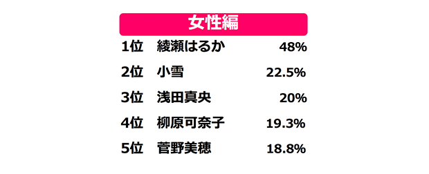 女性編、男性編ともに今年もっとも活躍しているフィギアの「浅田真央選手」「羽生結弦選手」がランクインした。女性編では柳原可奈子が数々の綺麗な女優を抑えてお笑い芸人で唯一のランクインとなり健闘した。また、5位以内にランクインはしなかったものの去年「あまちゃん」で一気にブレイクした能年玲奈がランクインを果たした。