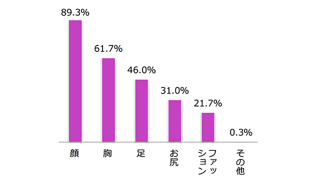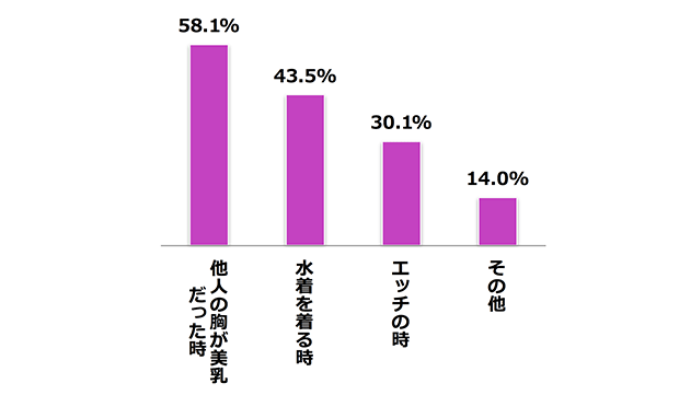 胸に悩みを感じる瞬間はいつですか?という質問では2位、3位の誰かに胸を見られる機会ではなく、自分が他人の胸を見た瞬間ということが分かり、他人の胸をチェックし自分と比べてしまう人が多いという結果となりました。また、70%以上がパートナーに胸を褒められたことが無いということが分かりました。