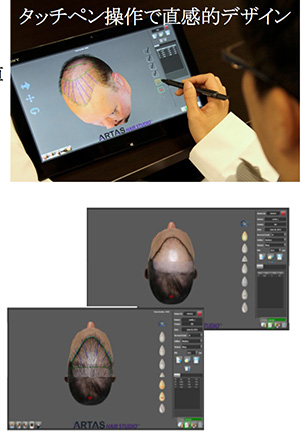 頭髪の生えていない部分に対して、ARTASが周りの頭髪の生えている方向や角度を計算し、それに合わせて適切な角度で頭皮に植毛を行うためのスリットを自動的に入れていく機能。Hair Studioと組み合わせることにより、イメージ通りの植毛を行うことができる。