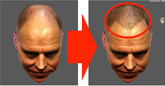 頭部の写真を5方向から取り込むことで、頭部の3Dモデルを作成し、実際に植毛を行った結果のイメージを提示しながらカウンセリングを行うことが可能。