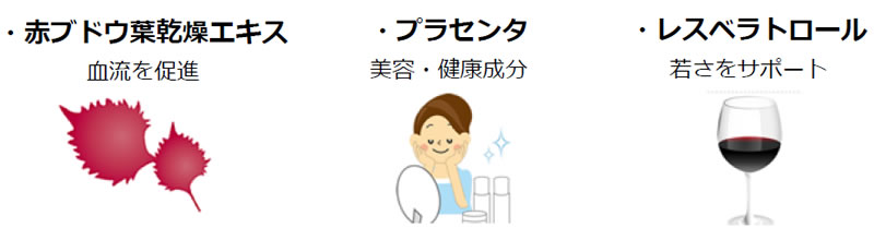 有用成分・天然由来の赤ブドウ葉エキスだけでなく、今話題のプラセンタエキスやレスベラトロールを配合し、すっきりした毎日を過ごしたい方へお勧めの認定栄養食品です。また、プラセンタはJHFAマーク(公益財団法人日本健康・栄養食品協会)の基準をクリアした商品。