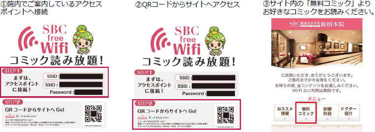 病院やクリニックに来院されたお客様に必ずと言っていいほど、付きまとうのが長い待ち時間のストレスです。湘南美容クリニックでは待合室でのお客様のストレスを減らし、快適に過ごしていただけるよう、「待ち時間の有効活用」「顧客様満足度の向上」を目的に専用FreeWi-Fiからお手持ちのスマートフォンやタブレットでコミックの無料読み放題ができる「シーモアBOOKSPOT(ブックスポット)」を導入いたします。