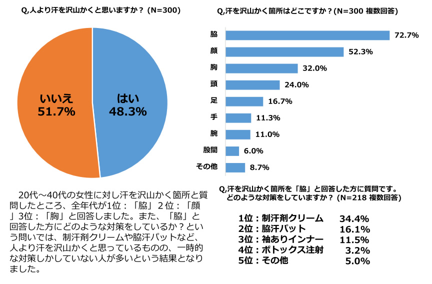 湘南美容クリニック(湘南美容グループ代表:相川佳之、所在地:東京都新宿区)は、「汗」に関するアンケート調査を全国の20~40代の女性300名に行いましたので、調査集計結果を発表いたします。