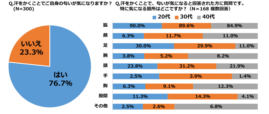 汗をかくことで匂いが気になると答えた女性は75%もいることが分かりました。汗を沢山かく箇所で は全世代同じ順位となりましたが、匂いが気になる箇所という質問では3位の回答が20代「頭」、30代 「足」、40代「胸」と年代によって異なる結果となりました。