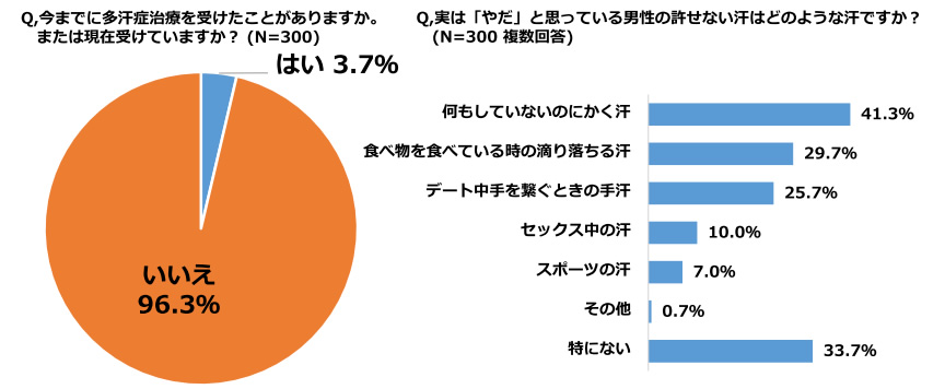 約50%の女性が人より汗を沢山かくと答えたのにも関わらず、今までに多汗症治療を受けたことがある 人はわずか3.7%という結果となりました。 女性が実は「やだ」と思っている男性の許せない汗では「デート中に手を繋ぐときの手汗」や「食事中 に滴り落ちる汗」を抑えて40%以上が「何もしていないのにかく汗」と回答しました。爽やかと思われて いる「スポーツの汗」もランクインし、汗は全体的に良い印象を受けないということが分かりました。