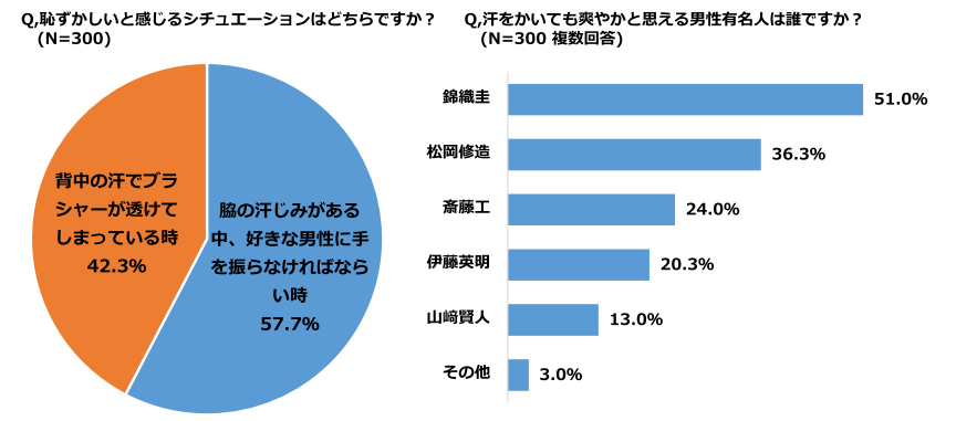 「脇の汗じみがある中、好きな人に手を振らなければならいない時」または「背中の汗でブラ ジャーが透けてしまっている時」のどちらが恥ずかしいと感じるシチュエーションですか?とい う問いでは、約60%が「脇の汗じみがある中、好きな人に手を振らなければならない時」と回答 しました。汗をかいても爽やかと思える男性有名人の栄えある第1位に輝いたのは「錦織圭」、2 位は「松岡修造」という結果となり、爽やか汗ランキングでは師弟関係が逆転する結果となりま した。