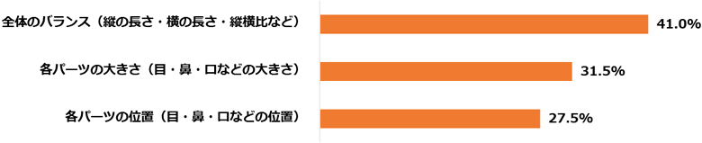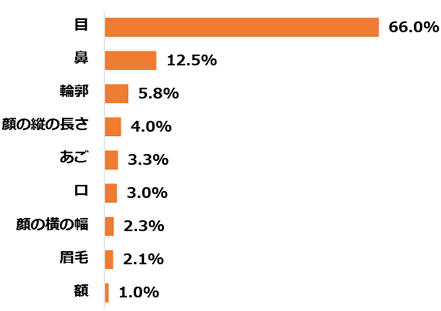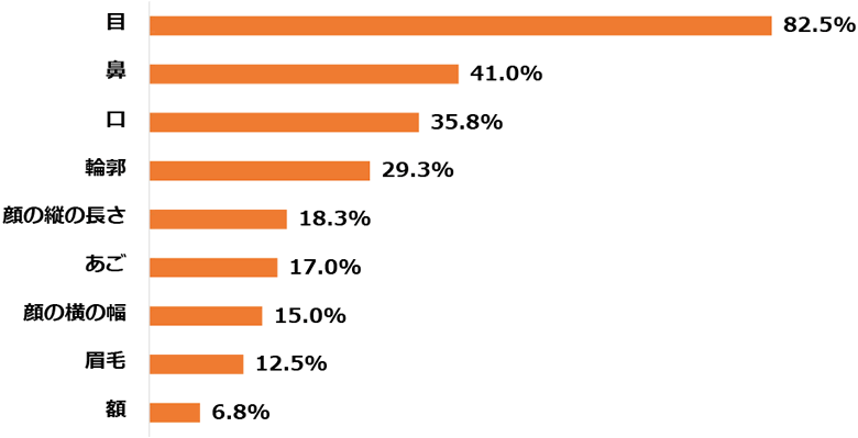 バランスが良くない箇所があると回答しました。男性の回答は「はい」と「いいえ」がほぼ同数でしたが、女性はバランスが良くない箇所があるという回答が65%以上となり、男性よりも自身の顔に厳しい評価をしていることが分かりました。顔の黄金比率で最も重要なのはどのパーツのバランスだと思いますか?という質問ではダントツの1位で「目」となりました。また、2位までは男女ともに同じ順位でしたが、3位は女性が「輪郭」、男性が「顔の縦の長さ」という結果となりました。