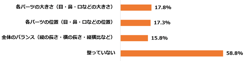 顔の黄金比率について質問したところ、「全体のバランス」が重要だと思っている人が多いということが分かりました。また、黄金比率の判断基準で自身が整っていると思うところで多かった回答は「各パーツの大きさ」となりました。