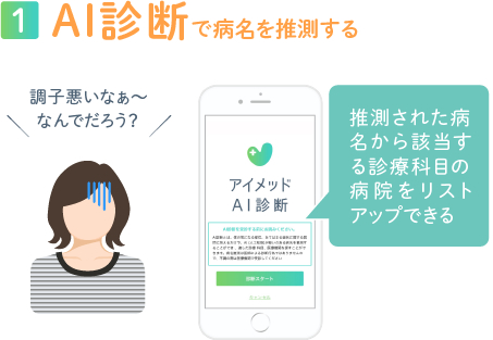 アイメッドは、こうした患者の悩みを解消するため、国内最大規模の病院やクリニックに関するネットワークを活用し、病院・クリニックの検索や予約、AI診断(※1)、医師と話せる遠隔診療(※2)など、ドクターをもっと身近に感じることのできる、医療機関総合アプリの決定版として開発いたしました。