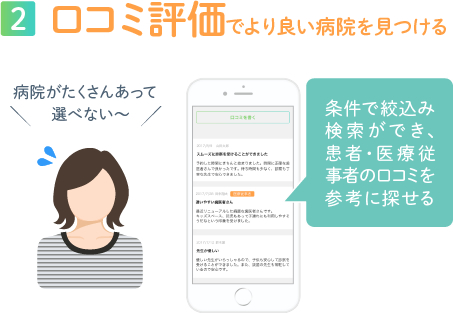 他の患者や医療従事者からの口コミ評価を参考に病院を選択できる。
