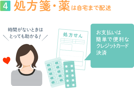 (4)処方箋や薬は自宅へ配送、支払もクレジットカードでスマート決済。